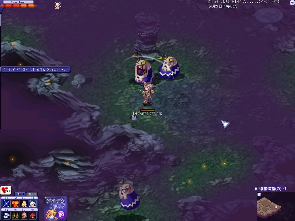 ランダム死んでたので露店で買った100スーツを装備してしばらく狩れそうな狩場を探し回ってたんだ